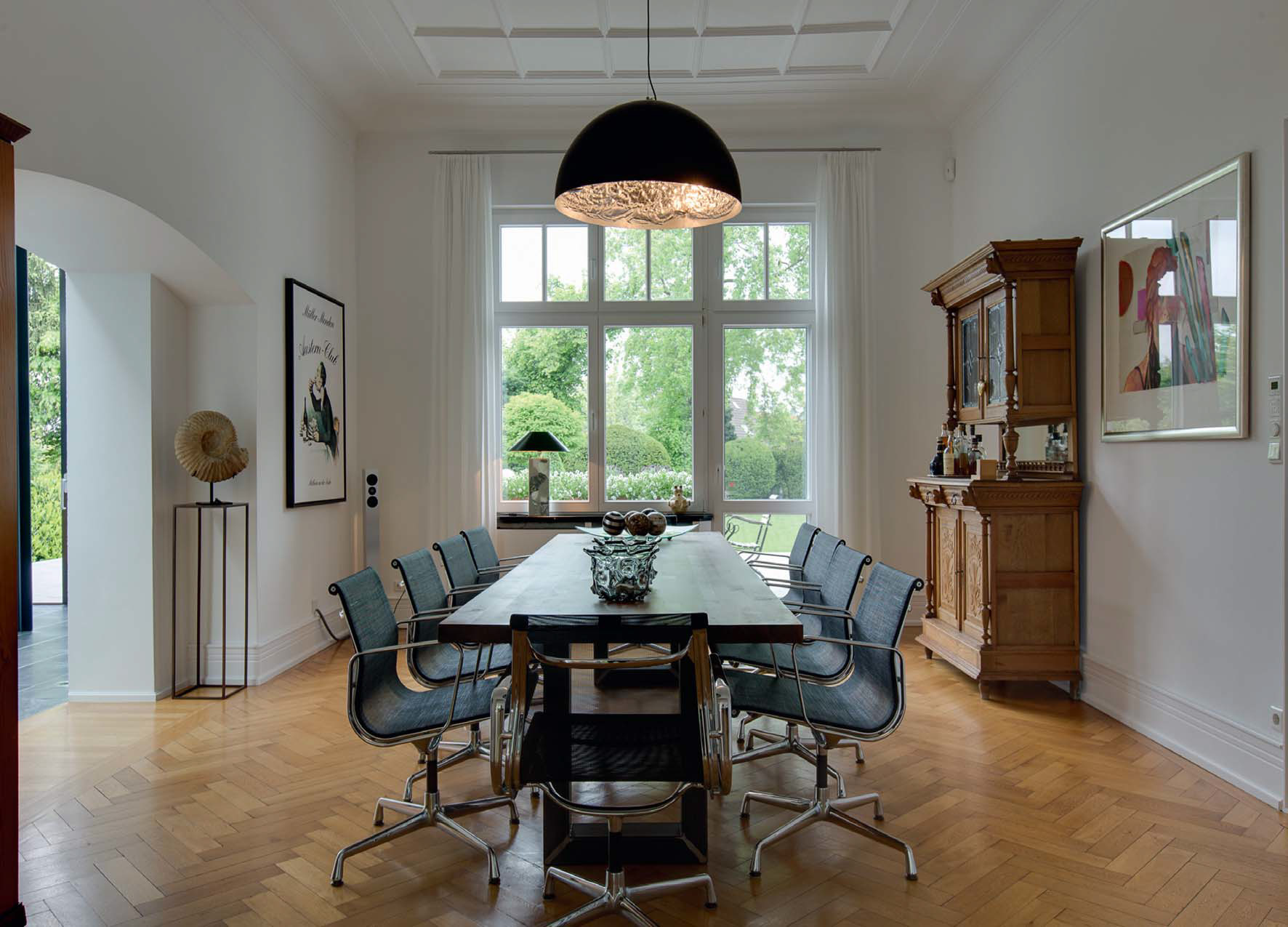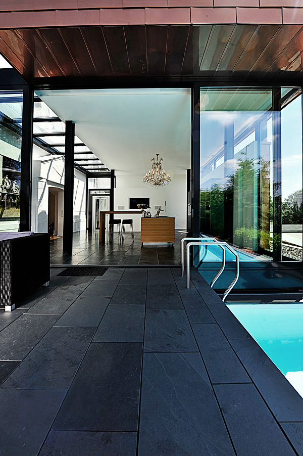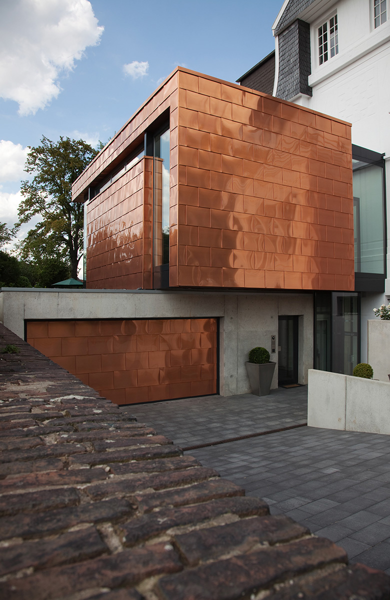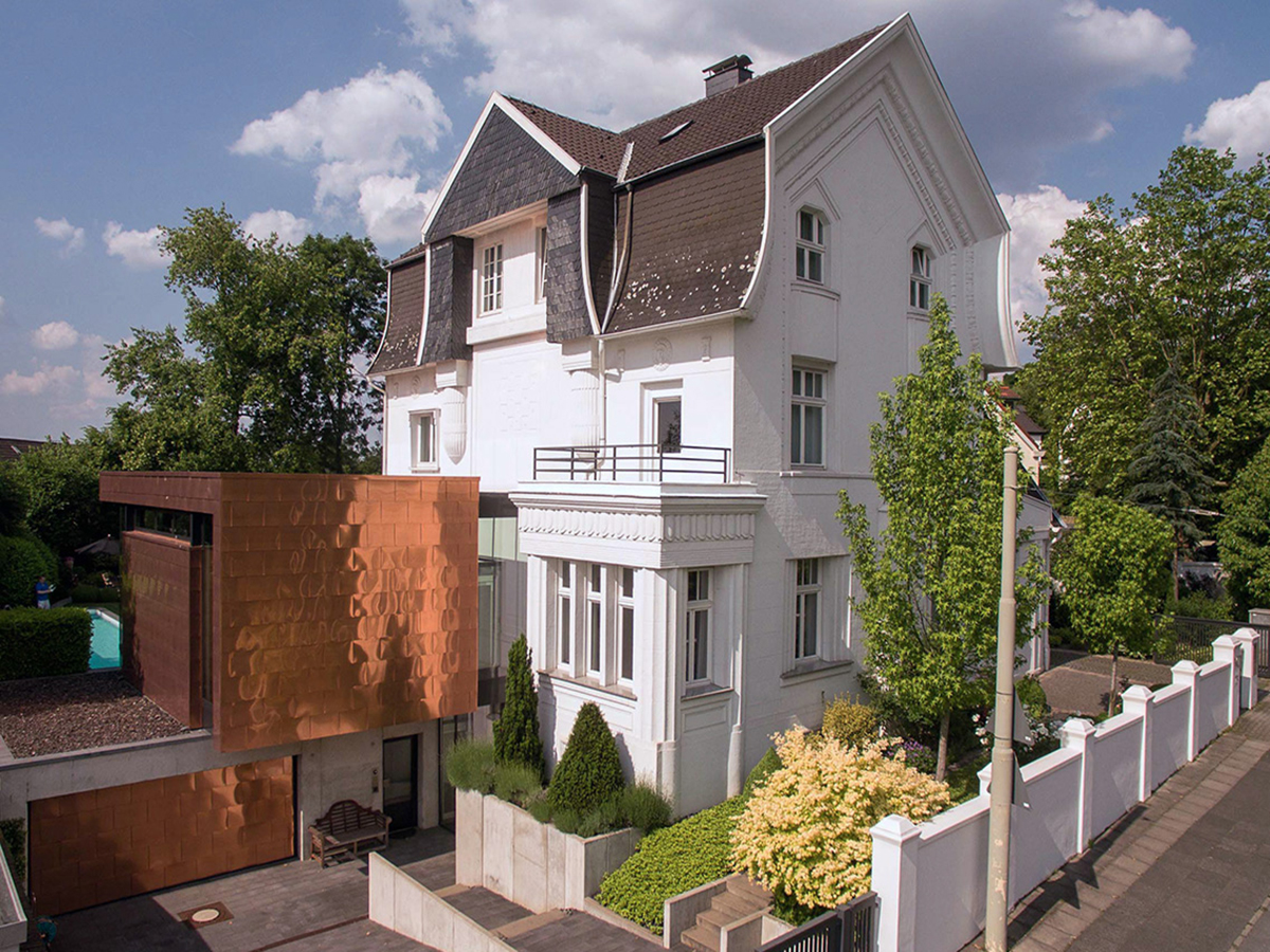 Im Erdgeschossbereich wurde die Villa um einen kupferglänzenden Anbau samt Terrasse und Sichtbeton-Pool erweitert. Die Kupferfassade greift die Materialität von Dachrinnen und Fallrohren auf – und ist eine Reminiszenz an die Industriekultur des Ruhrgebiets. Eine filigrane Glas/Stahlkonstruktion schließt den alten an den neuen Baukörper an und bringt viel Licht in den großzügigen neuen Wohnküchenbereich. Integriert ist ein historisches Portal, das den Blick aus der im Neubau untergebrachten Eventküche in den Essbereich des Altbaus freigibt – und zugleich ein reizvolles Spiel mit Innen und Außen eröffnet.