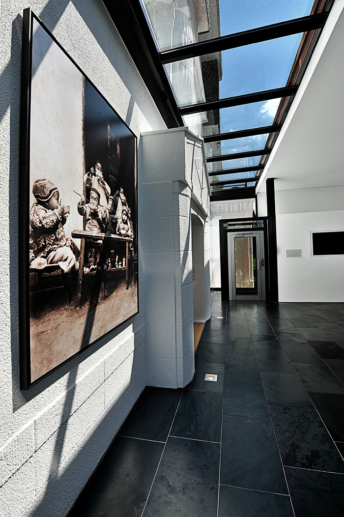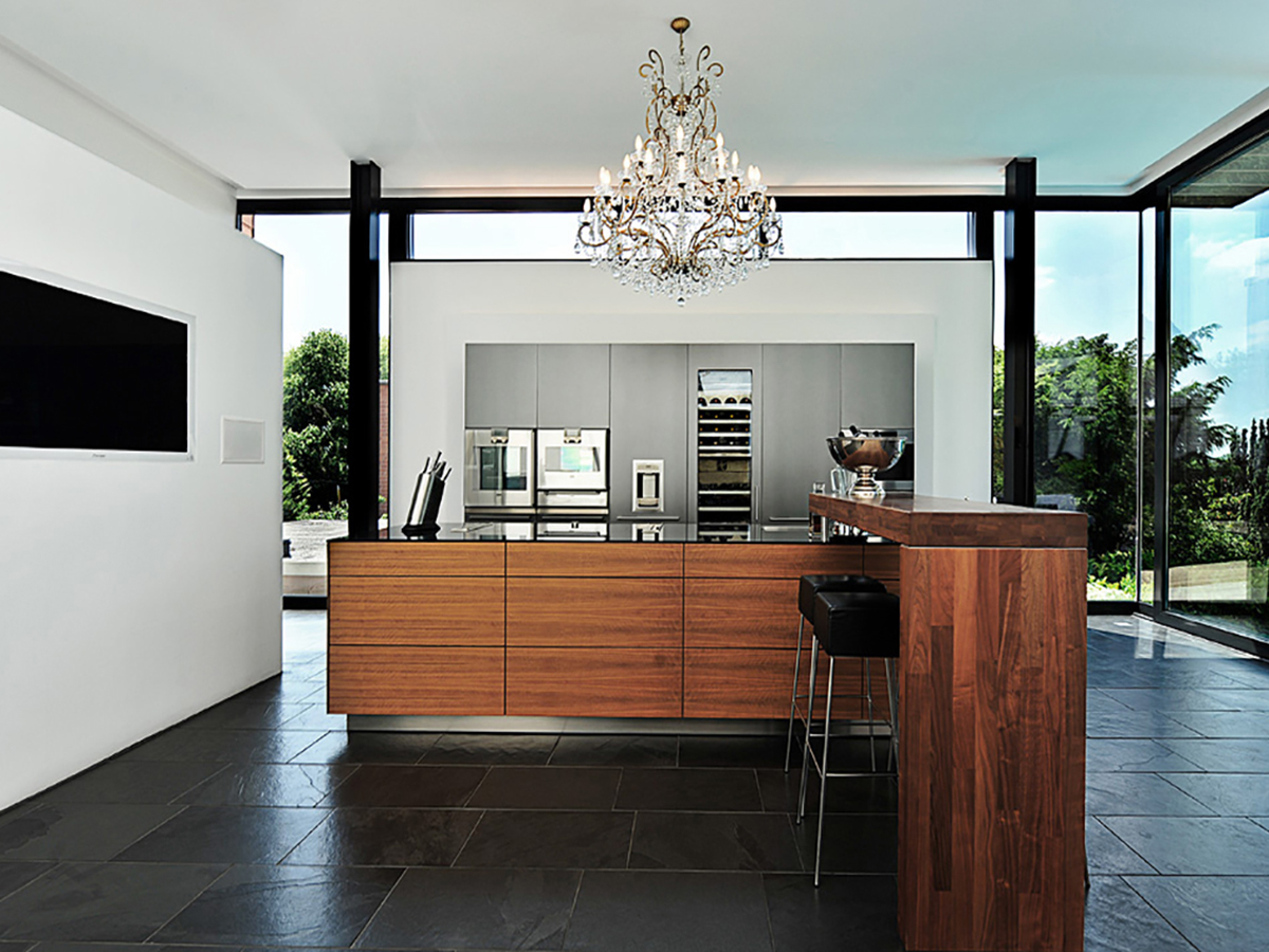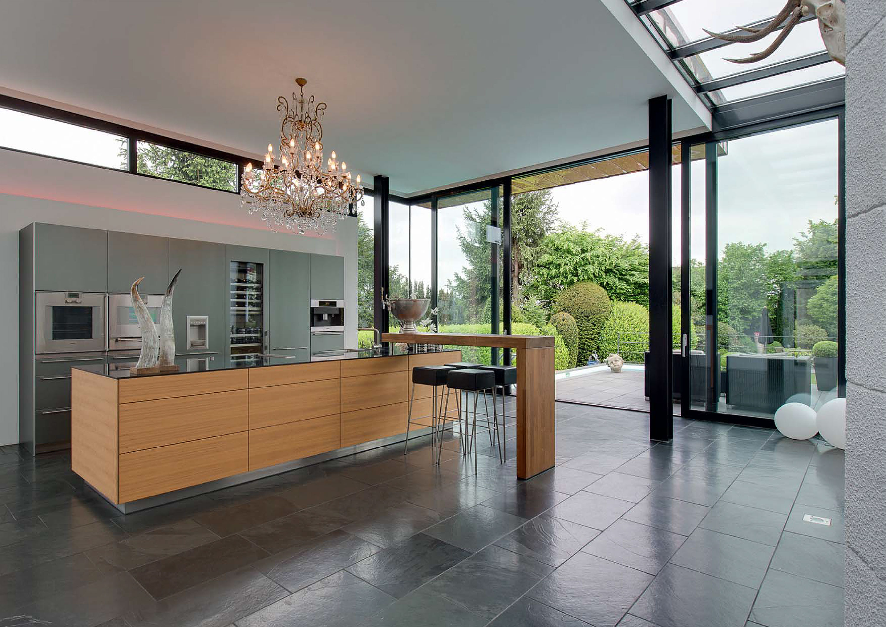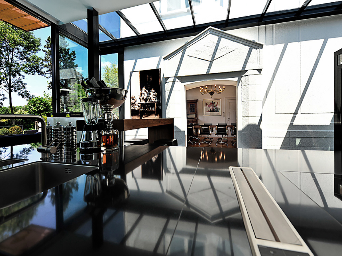 Aufgebaut ist der Kubus durch eine Stahl-Glas-Konstruktion mit vier Meter hohen Wänden und einer großflächigen Schiebetür: Diese ermöglicht den schwellenlosen Zugang auf die mit Schieferplatten ausgelegte Terrasse. Im Inneren des Kubus ergeben sich durch den wechselnden Lichteinfall aus Fenstern und Glasdecke raffinierte Licht- und Schattenreflexe – so wird die Eventküche spektakulär und immer wieder neu in Szene gesetzt.