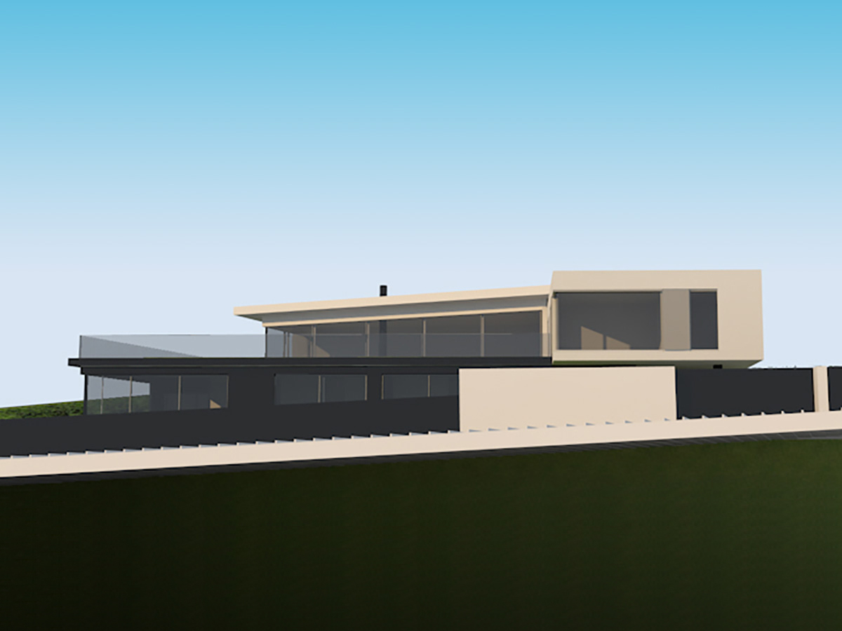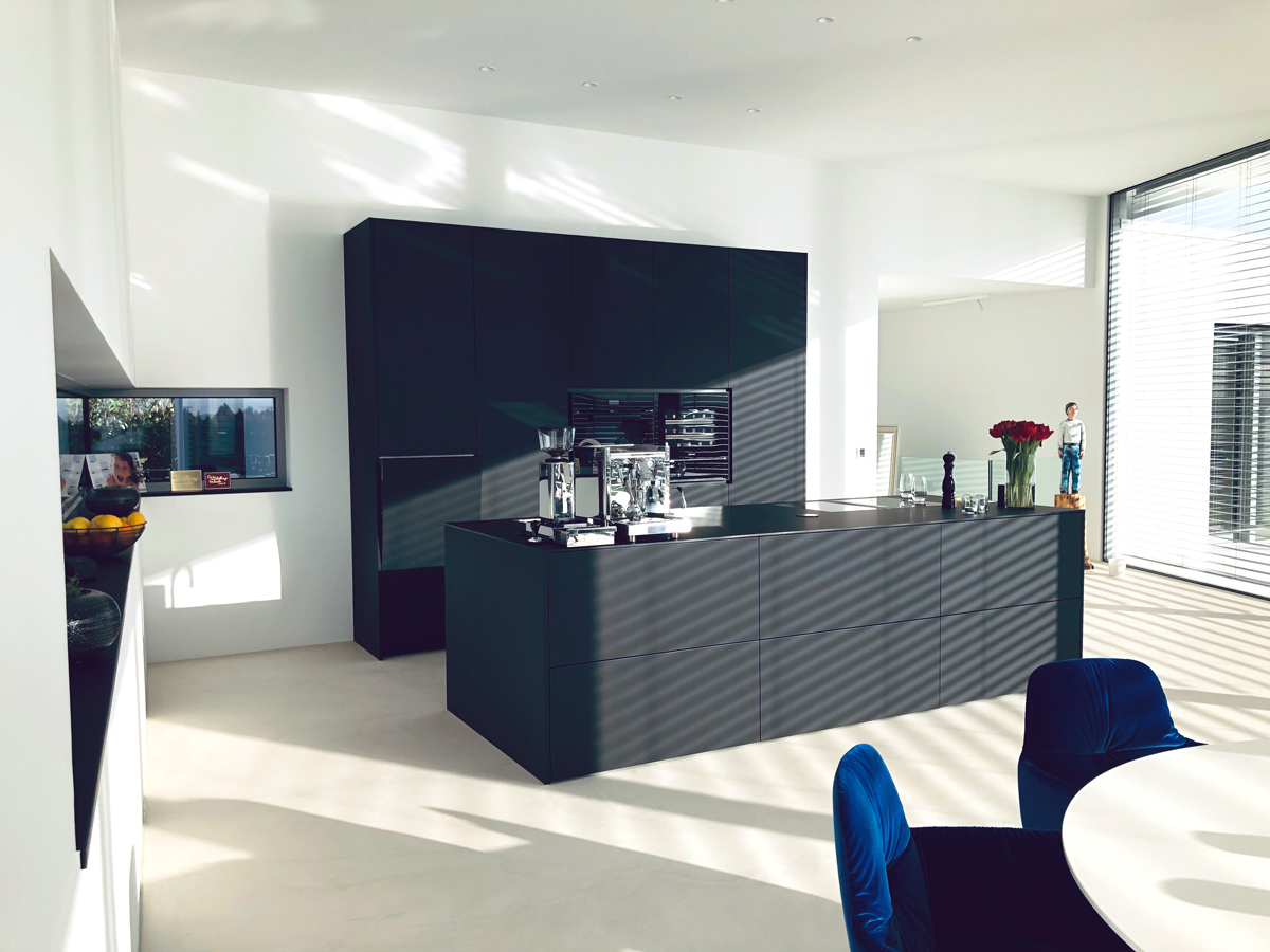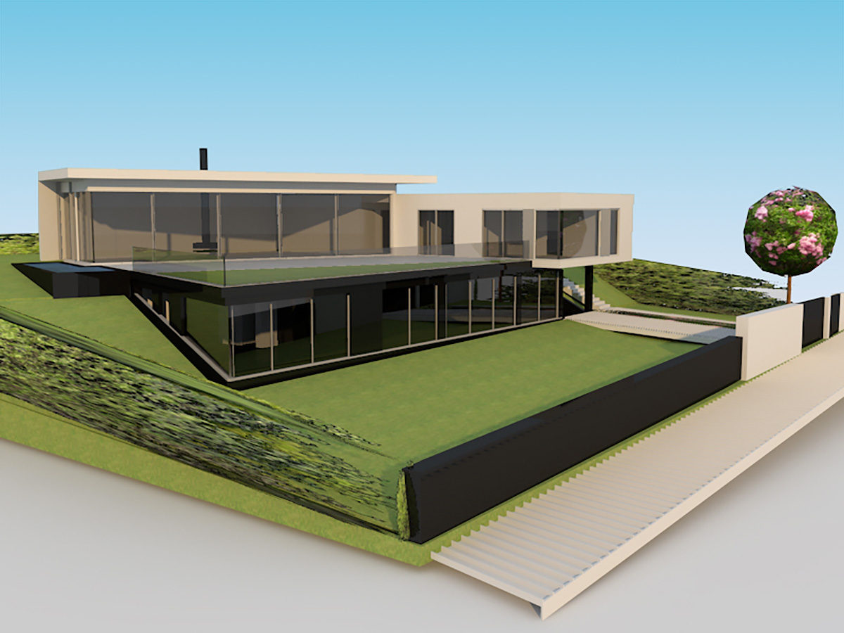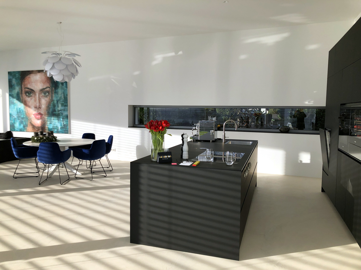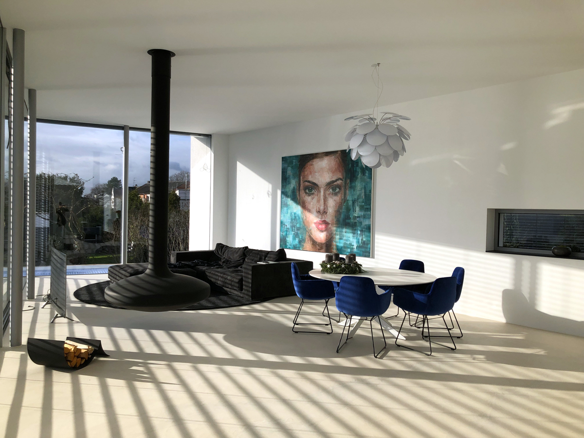 In der Architektur geht es uns nicht nur darum, Häuser zu gestalten, die für sich genommen schön sind: Ein neues Gebäude muss sich immer optimal gegenüber der jeweiligen Umgebung positionieren. Dieses Haus in Bochum-Stiepel sollte in einer Hanglage errichtet werden, von der sich spektakuläre Blicke ins Gelände bieten – ein echtes „Asset“, der zum Ausgangspunkt unserer Planungen wurde. Das Haus wurde von uns bewusst so ausgerichtet, dass die glücklichen Bewohner und ihre staunenden Gäste die Aussicht optimal genießen können. Der grandiose Weitblick wird durch eine fast rahmenlose riesige Fensterfront spektakulär in Szene gesetzt – ein einzigartiges Raumerlebnis, das täglich neu beglückt. Die über Eck verglaste Front ist per Fernbedienung zu steuern: Sie verbindet den Wohnraum mit der angrenzenden Terrasse und dem bodengleichen Pool und erweitert ihn damit noch.