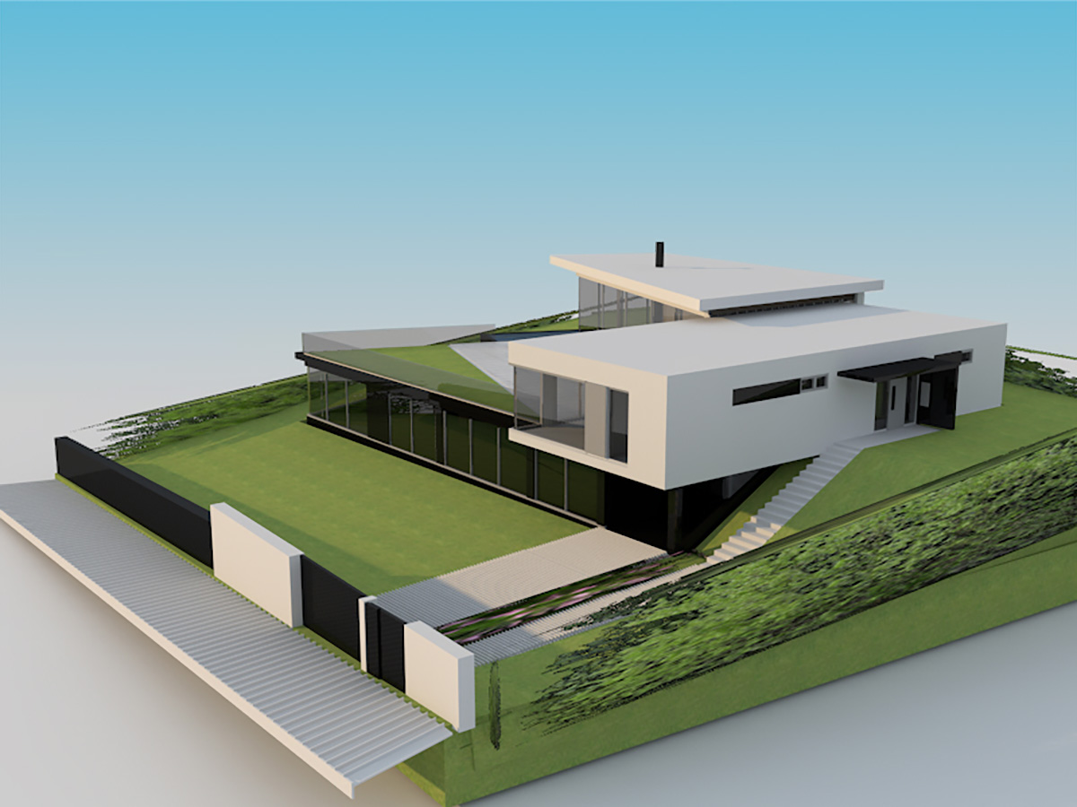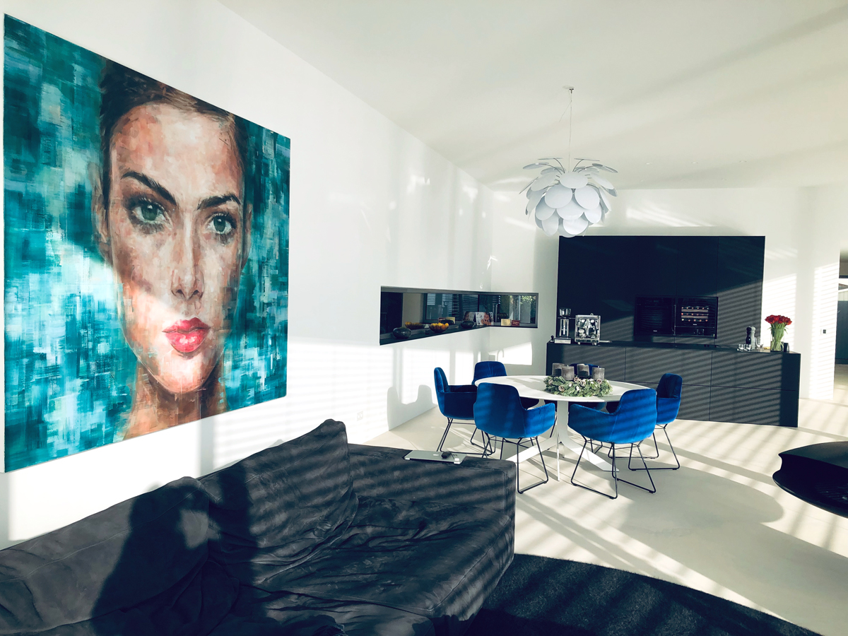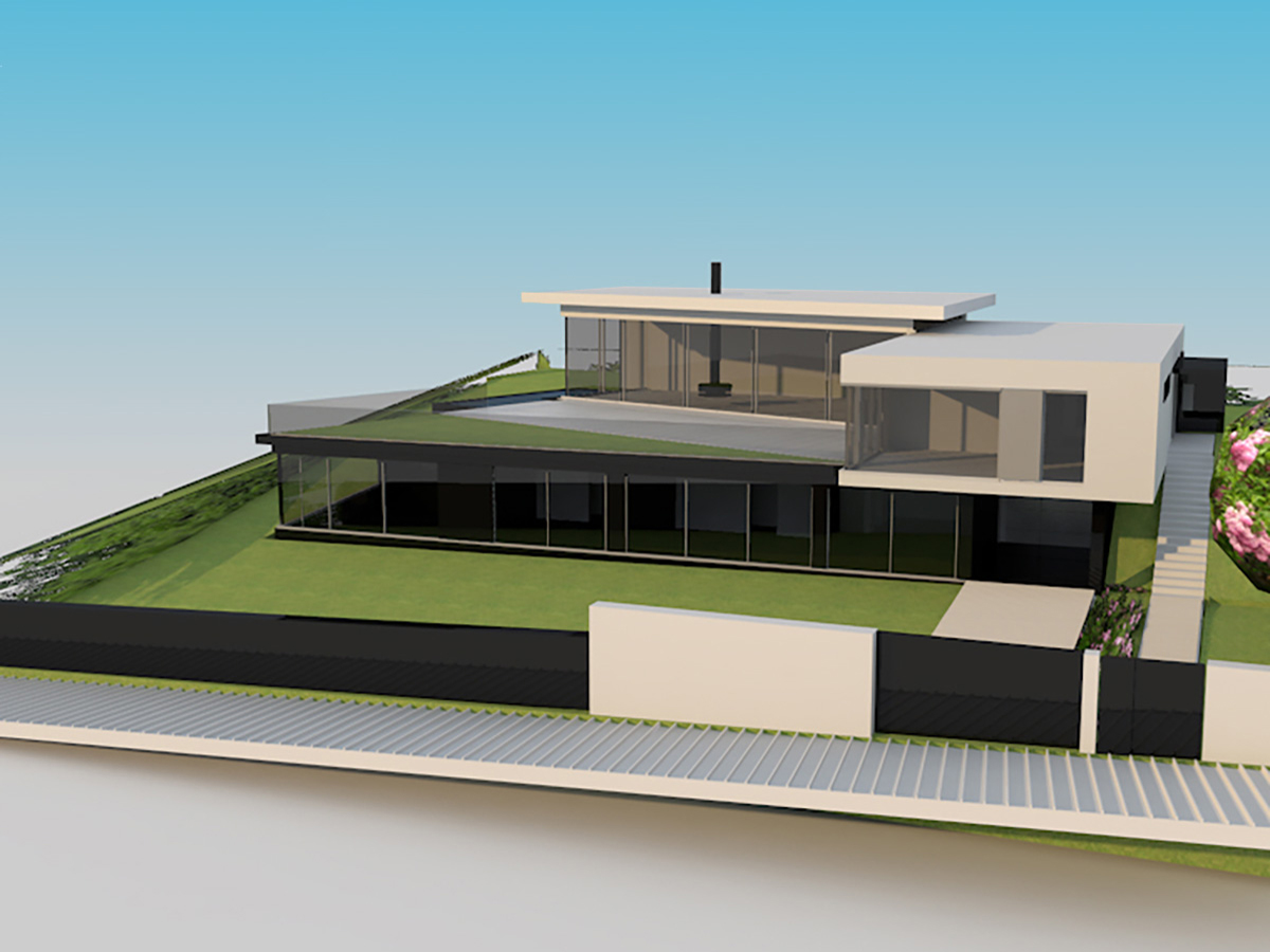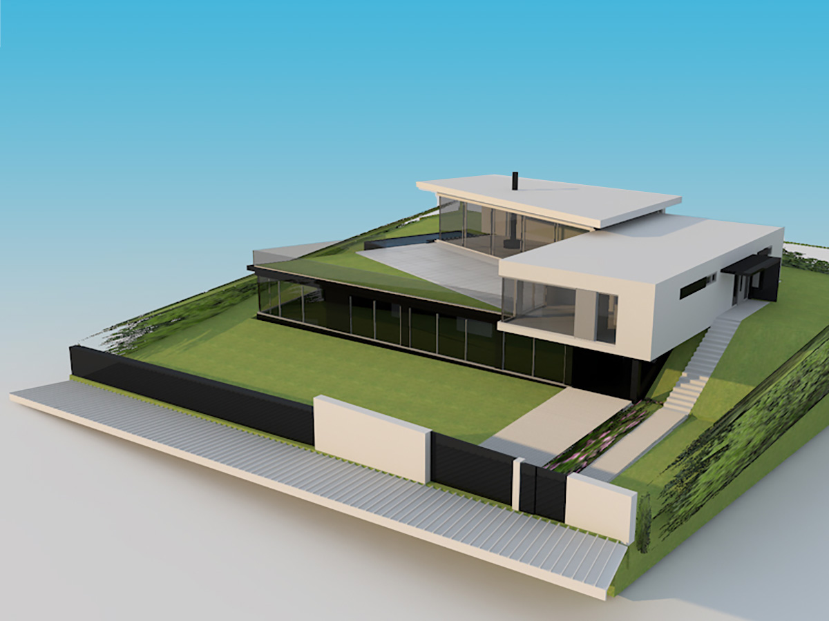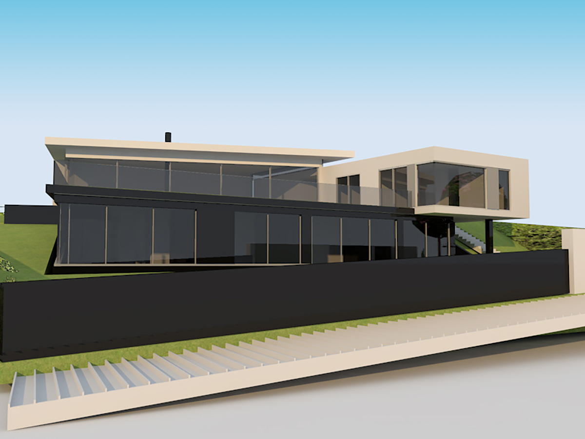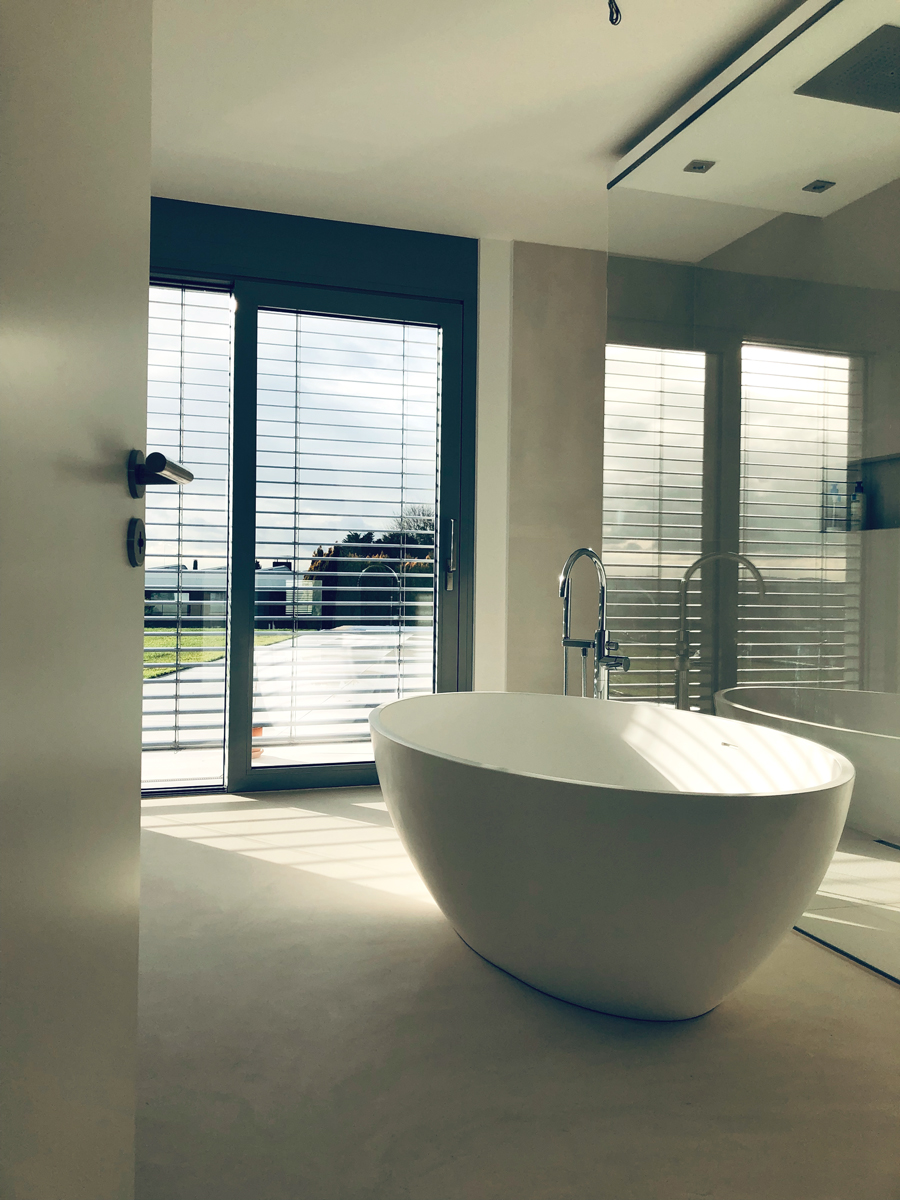 In der Architektur geht es uns nicht nur darum, Häuser zu gestalten, die für sich genommen schön sind: Ein neues Gebäude muss sich immer optimal gegenüber der jeweiligen Umgebung positionieren. Dieses Haus in Bochum-Stiepel sollte in einer Hanglage errichtet werden, von der sich spektakuläre Blicke ins Gelände bieten – ein echtes „Asset“, der zum Ausgangspunkt unserer Planungen wurde. Das Haus wurde von uns bewusst so ausgerichtet, dass die glücklichen Bewohner und ihre staunenden Gäste die Aussicht optimal genießen können. Der grandiose Weitblick wird durch eine fast rahmenlose riesige Fensterfront spektakulär in Szene gesetzt – ein einzigartiges Raumerlebnis, das täglich neu beglückt. Die über Eck verglaste Front ist per Fernbedienung zu steuern: Sie verbindet den Wohnraum mit der angrenzenden Terrasse und dem bodengleichen Pool und erweitert ihn damit noch.