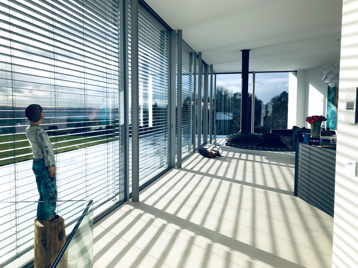 Zu Realisierung der riesigen, fast 400 Kilo schweren Fensterfront wurde das modulare Fenster-System Sky-Frame eingesetzt, das Schweizer Ingenieurkunst mit zeitloser Ästhetik vereint.