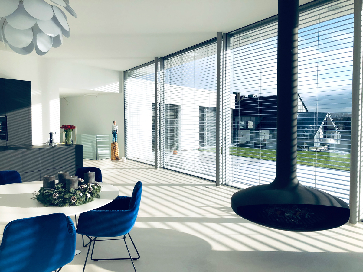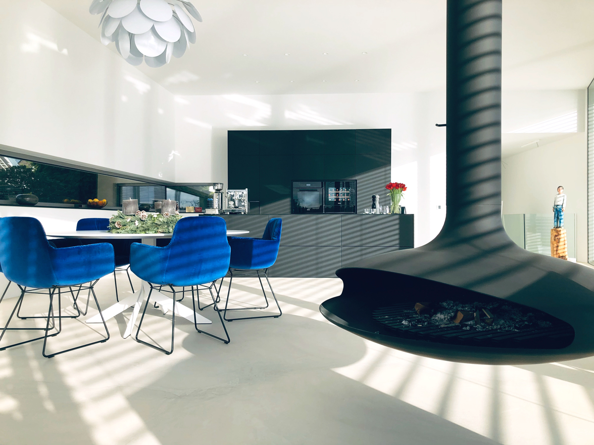 Die verschiedenen Wohn- und Lebensräume sind so angeordnet, dass sie in ihrer Nutzung dem natürlichen Sonnenverlauf folgen – angefangen beim Frühstück in der aufgehenden Sonne. Das tägliche Familienleben spielt sich in einem 3,5 Meter hohen, lichtdurchfluteten Raumkubus mit Zeltdach ab, der die offenen Bereiche Essen, Kochen, Wohnen beherbergt und den Bedürfnissen der Bewohner optimal entspricht. Ein frei hängender schwarzer Stahlkamin bildet den Mittelpunkt – eine Reminiszenz an die sprichwörtliche Feuerstelle, um die sich seit Erfindung des Feuers jede Gemeinschaft versammelt.