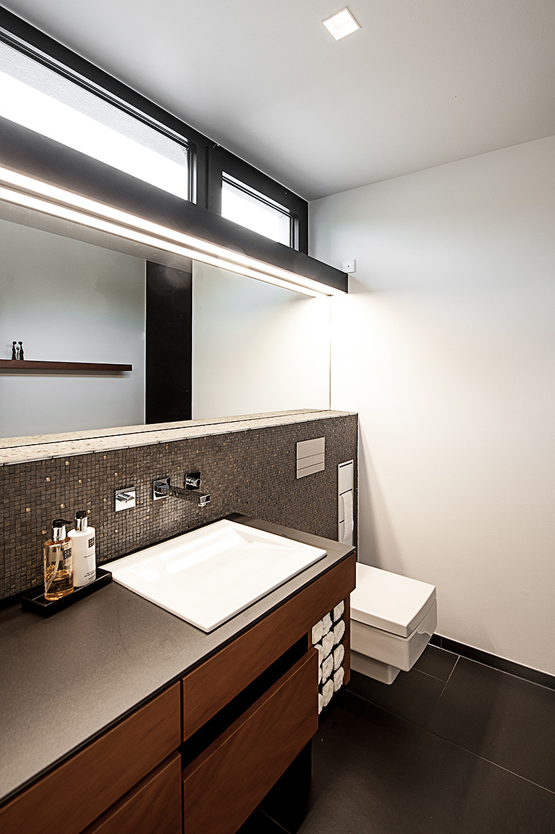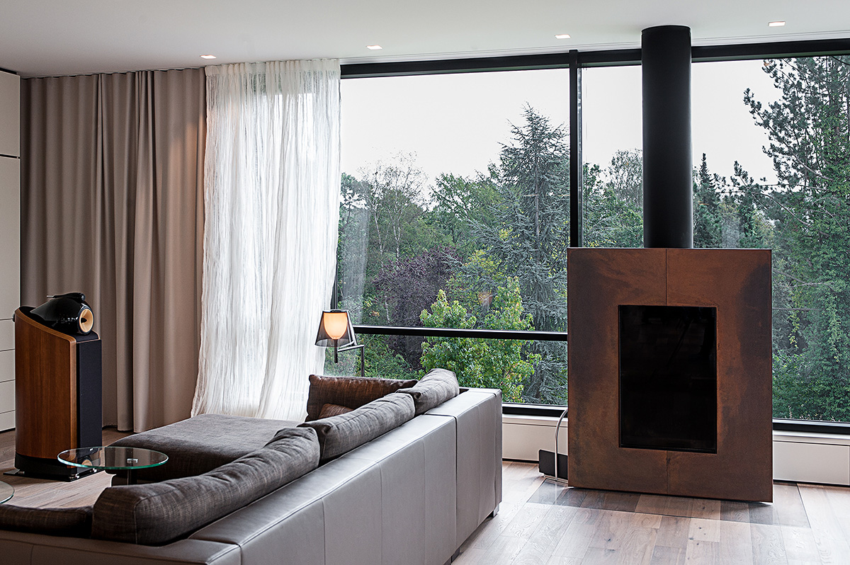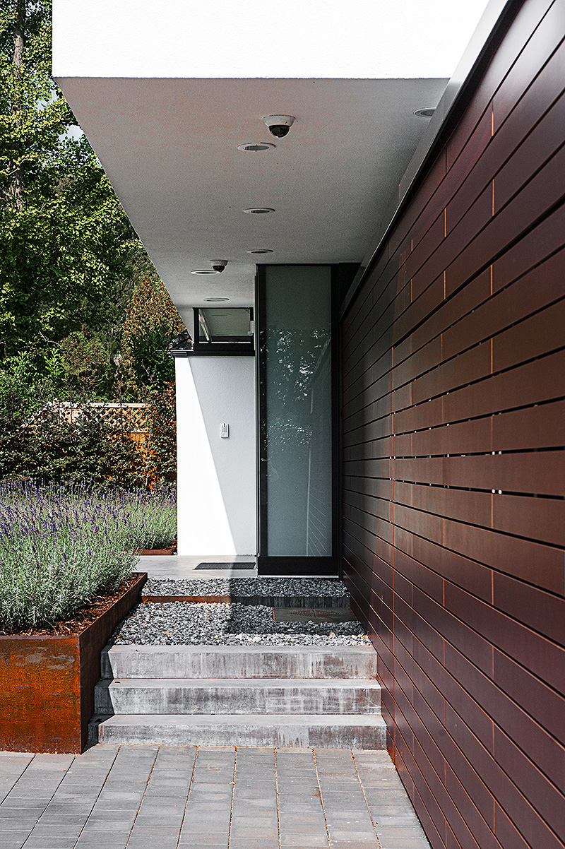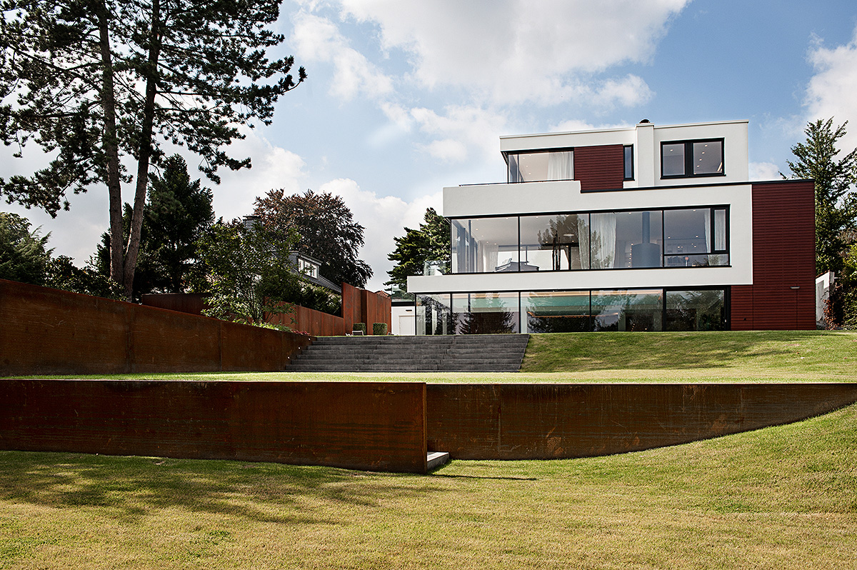Im Garten werden durch die verschiedenen Ebenen unterschiedliche Nutzungen generiert, beispielsweise Spielflächen für die Kinder. Die Stahlwände bieten Hintergründe für Bepflanzungen und Lichtinszenierungen – und schützen gegen unerwünschte Einblicke. Nachhaltige Energienutzung und Ressourcenschonung wurden von Anfang an mitgeplant. So wird der Energiebedarf über eine Wärmepumpe gedeckt. Nur bei Lastspitzen springt eine hocheffiziente Gasbrennwertheizung ein. Betonkernaktivierung zur Kühlung der Schlafräume, ein Smart-Home-System für die Steuerung der Gebäudetechnik und außenliegende Raffstoreanlagen zur Verschattung der riesigen Fensterfronten sind weitere Beispiele hierfür.