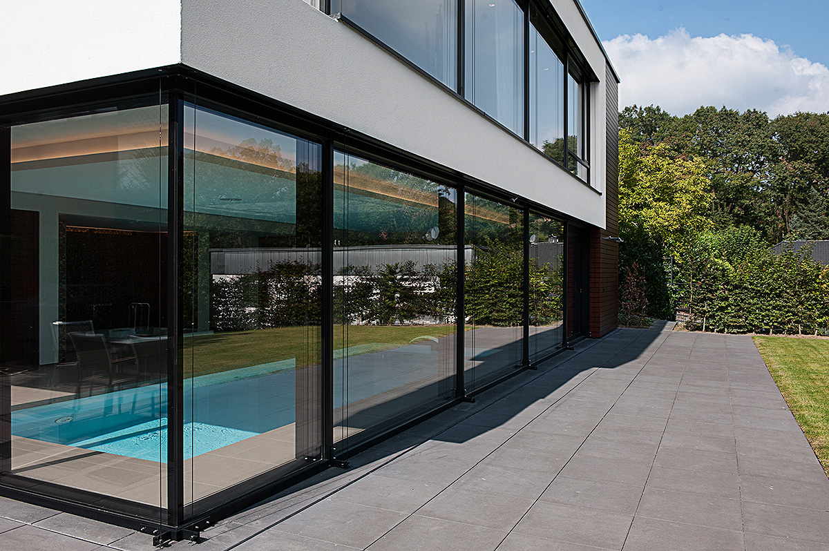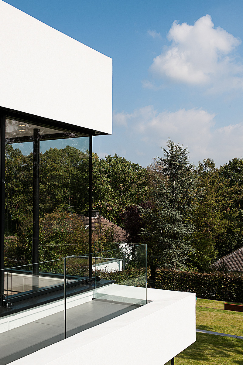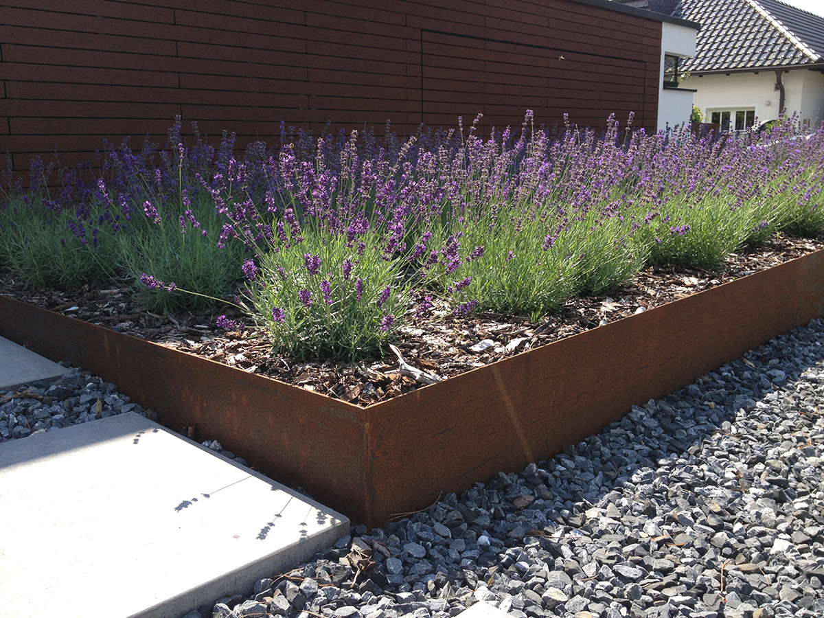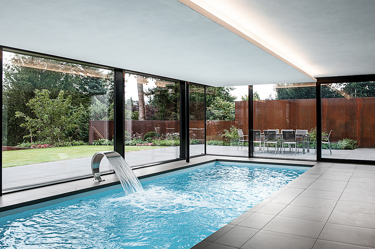 Im Garten werden durch die verschiedenen Ebenen unterschiedliche Nutzungen generiert, beispielsweise Spielflächen für die Kinder. Die Stahlwände bieten Hintergründe für Bepflanzungen und Lichtinszenierungen – und schützen gegen unerwünschte Einblicke. Nachhaltige Energienutzung und Ressourcenschonung wurden von Anfang an mitgeplant. So wird der Energiebedarf über eine Wärmepumpe gedeckt. Nur bei Lastspitzen springt eine hocheffiziente Gasbrennwertheizung ein. Betonkernaktivierung zur Kühlung der Schlafräume, ein Smart-Home-System für die Steuerung der Gebäudetechnik und außenliegende Raffstoreanlagen zur Verschattung der riesigen Fensterfronten sind weitere Beispiele hierfür.