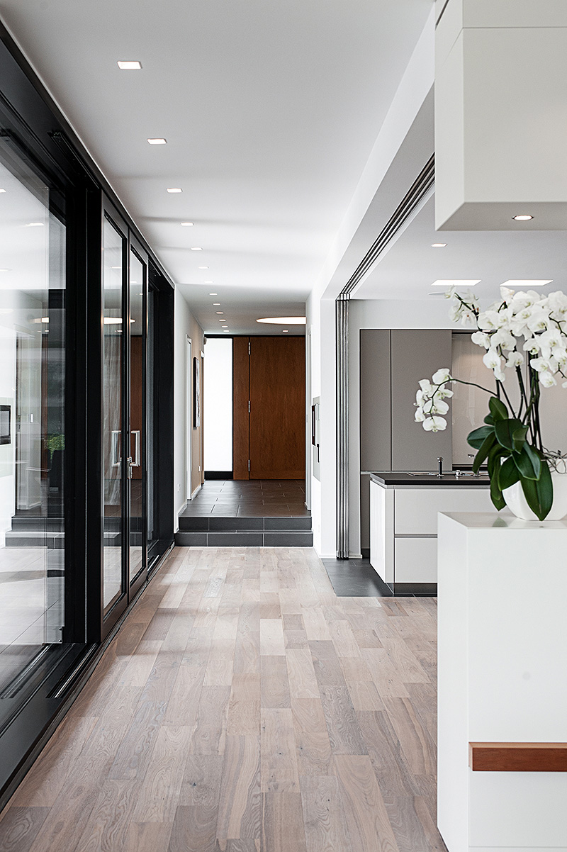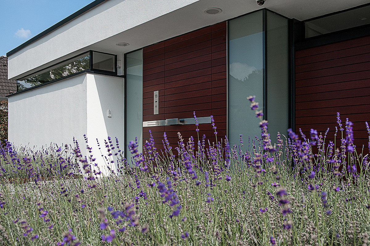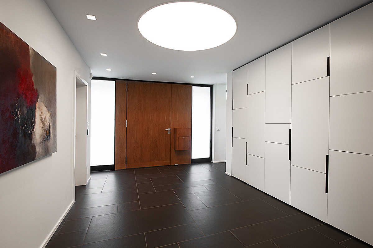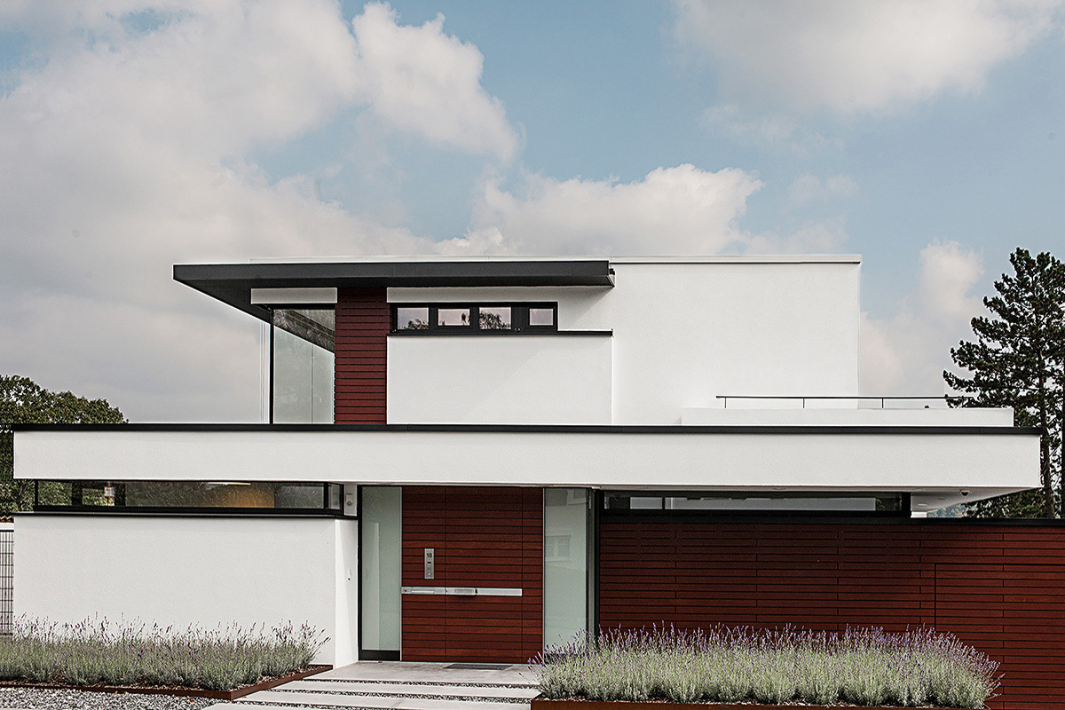 Mein Ziel als Architektin ist es immer, eine Haltung zu vermitteln – bei diesem Objekt in Essen-Werden bedeutete das: Zurückhaltung. Zur Straße hin gibt sich dieses Wohnhaus mit seiner teilweise holzverkleideten Fassade eher diskret, fast introvertiert – nichts deutet auf die herausgehobene Position des in der Öffentlichkeit stehenden Hausbesitzers hin. Doch schon beim Betreten des nach Süden ausgerichteten Gebäudes kommt der Besucher ins Staunen und aus diesem nicht mehr heraus: Über die Empfangshalle erstreckt sich eine großzügige Blickachse hin zum Wohnraum mit imposanter Fensterfront und freiem Blick auf Garten und angrenzende Natur.