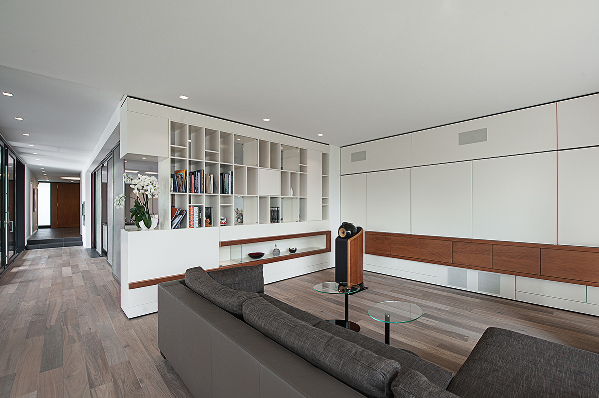 Das Haus verfügt über zweieinhalb Geschosse. Die öffentlichen Bereiche für Kochen, Essen und Wohnen befinden sich im Erdgeschoss und sind von der Eingangshalle aus direkt zugänglich. Ein drehbarer und mit auseinanderfahrbaren Stahlplatten versehener Kamin schließt den Raum vor der Fensterfront ab. Eine geradläufige Treppe im Bereich der Eingangshalle schafft die Verbindung in die privaten Lebensräume im Obergeschoss. Hier befinden sich neben drei Bädern die Kinderzimmer, ein Gästezimmer und der Schlafbereich der Hauseigentümer – alle mit Zugang zu vorgelagerten, nach Süden orientierten Terrassen.