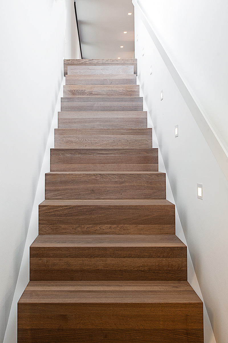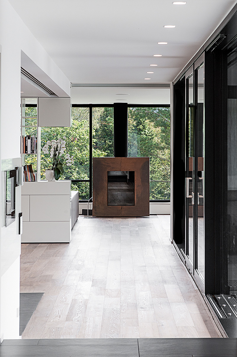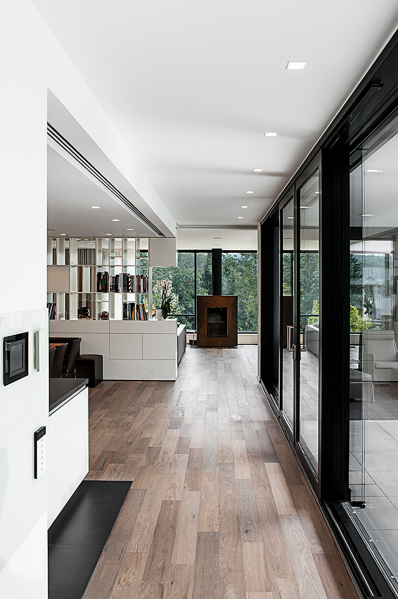 Rechtwinklig zu dieser Achse liegt eine Innenterrasse mit deckenhoher Verglasung, die den Baukörper wie ein Atrium halbiert. Sie öffnet die Räume in Richtung Süden und fängt durch transparente Gebäudefugen auch das Licht der untergehenden Sonne aus Westen ein.